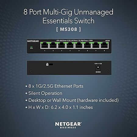 Turbocharge Your Network with NETGEAR’s 2.5G Multi-Gigabit Switch!Step into the future of connectivity with the NETGEAR 8-Port 2.5G Multi-Gigabit Ethernet Unmanaged Network Switch (MS308). Unleash lightning-fast speeds and seamless performance for all your devices.Key Benefits: