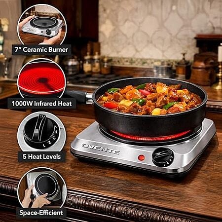 $17.17* | OVENTE 7” Ceramic Glass Infrared Single Burner 1000W Electric Hot Plate at Amazon