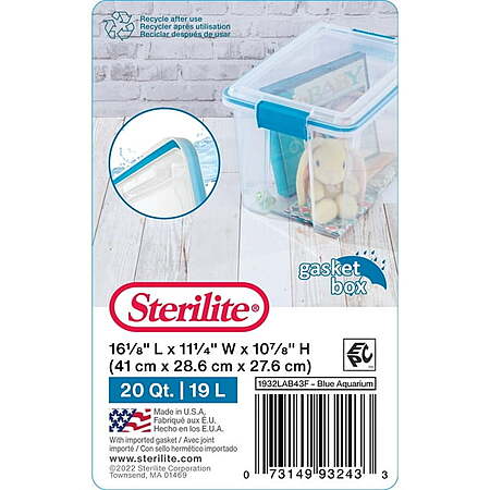 Declutter Your Life with Sterilite Storage Solutions!20-Quart Clear Gasket BoxKeep your belongings safe and organized with this durable Sterilite storage box. The clear design allows you to easily see what’s inside, while the blue latches and gasket ensure a secure seal to protect against moisture and pests.6-Quart Clear Plastic Storage Bins (10-Count)These compact storage bins are perfect for organizing smaller items around your home or office. The snap-on lids keep contents secure, and the clear plastic allows for easy identification of what’s inside.80-Quart Clear Gasket BoxNeed serious storage space? This extra-large Sterilite box has you covered. The clear design, blue latches, and gasket provide maximum visibility and protection for your larger items.