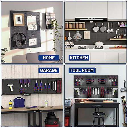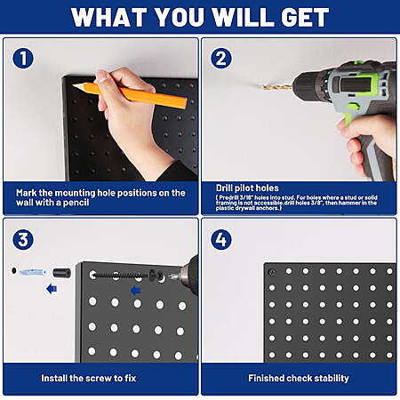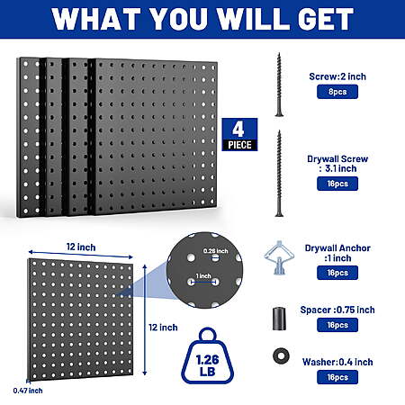 - Complete Installation Kit: Includes 4 pegboards and all mounting accessories (washers, spacers, drywall anchors, screws). Easy-to-follow instructions ensure hassle-free setup.