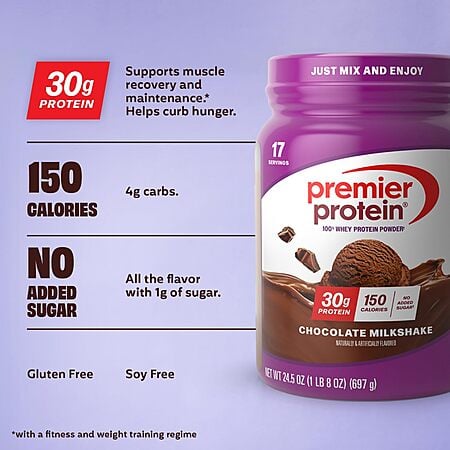 24.5-Oz Premier Protein 100% Whey Protein Powder (Chocolate Milkshake) $18.14
