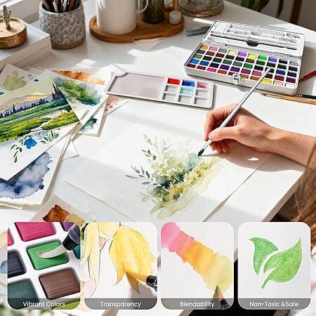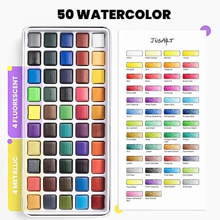 Unleash Your Inner Artist with the JusArt Watercolor Paint Set! Dive into a World of Color This watercolor paint set boasts 50 vibrant colors, perfect for both beginners and seasoned artists. Explore endless possibilities for painting, illustration, and coloring books. Create Art Anywhere, Anytime Everything you need is packed into a single, portable case. Ideal for travel sketching, outdoor painting, and classroom projects. Everything You Need to Get Started This comprehensive art kit includes: