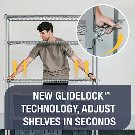 - Adaptable Design: Adjust the sturdy metal shelving in seconds using patented GlideLock™ technology for quick and secure positioning.