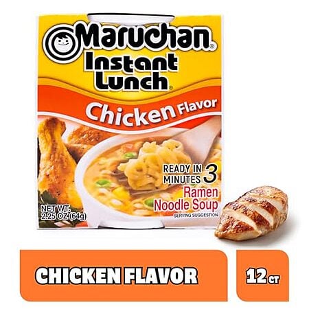 Enjoy a quick and satisfying meal with Maruchan Instant Lunch! This convenient and flavorful option is perfect for busy days or anyone craving a warm, comforting snack.### Product Highlights:* Convenient and easy to prepare* Delicious chicken flavor* Perfect for a quick lunch or snack### Each Package Contains:* 12 individual 2.25-oz cups of Maruchan Instant Lunch (Chicken)