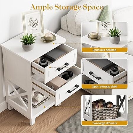 • Spacious Design: 2 Drawers and an open shelf provide ample storage for your bedside essentials.