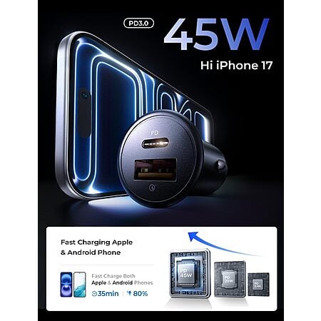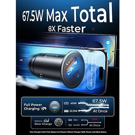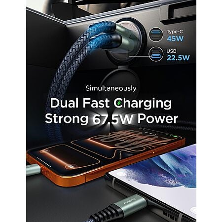 AINOPE 67.5W Super Mini Car Charger USB C 45W PD&QC 3.0 Fast Charging with C to Lighting Cable $6