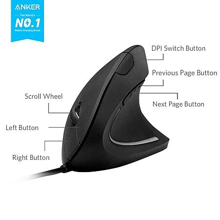 Anker USB Wired Vertical Mouse, Ergonomic Design Mouse for Computer and Laptop, 5 Buttons, 1000/1600 DPI, Optical Technology, USB Corded – Black $16.99