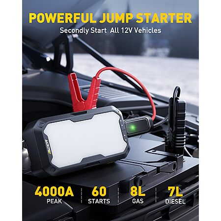 - Powerful Jump Starter: Delivers an impressive 4000A peak current, capable of reviving 8L gas and 7L diesel engines, even with fully drained batteries.