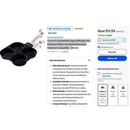 Carote 4-Cup Nonstick Egg and Burger Pan, Breakfast Skillet with Divided Sections $12.99 or $9.99 AC