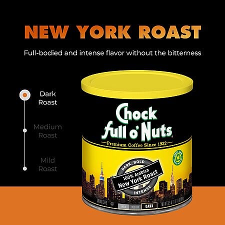 Wake Up and Smell the Aroma!Indulge in the rich, bold flavor of Chock Full o’ Nuts New York Roast Ground Coffee. This dark roast will invigorate your senses and start your day off right.Key Features: