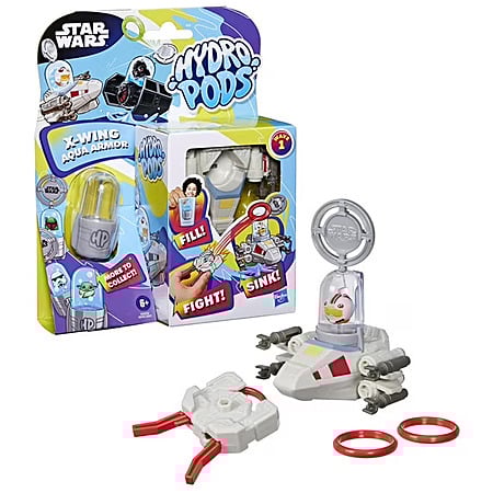 - Luke Skywalker & X-Wing: Includes 1 Luke Skywalker Hydro Pod (4 inches tall, 10 cm), 1 X-wing Aqua Armor, 1 target, 1 launcher, and 3 discs.