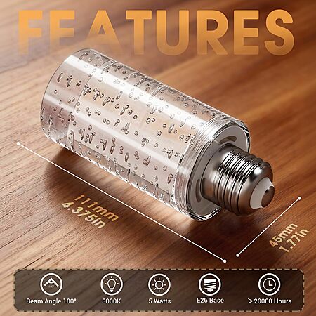 • Decorative Acrylic Bubble Design & Soft Glow: A unique cylindrical bubble design emits a soft, flicker-free 500 lumens of warm white light, perfect for decorative lighting.