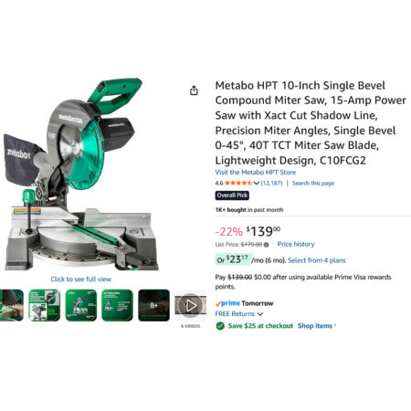Metabo HPT 10-Inch Single Bevel Compound Miter Saw, 15-Amp, C10FCG2. YMMV – Price after $25 Savings at Checkout $114 @Amazon