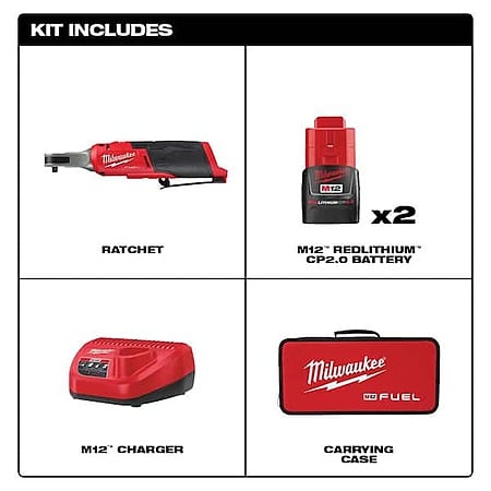 - Kit Includes: M12 FUEL 1/4 in. high speed ratchet (2566-20), 2x M12 REDLITHIUM CP2.0Ah batteries (48-11-2420), M12 charger (48-59-2401), and a soft carrying case.