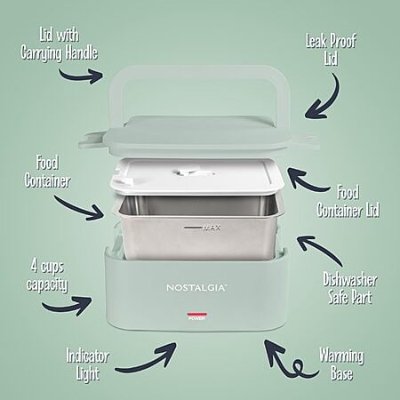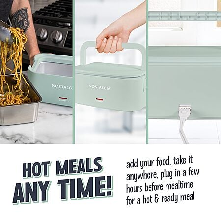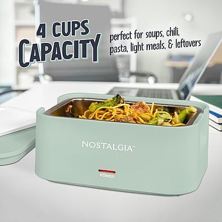 Nostalgia 32-Ounce Heated Electric Lunch Box – Travel Size 4 Cup Capacity Foldable Carry Handle, Detachable Cord – Sage $19.99