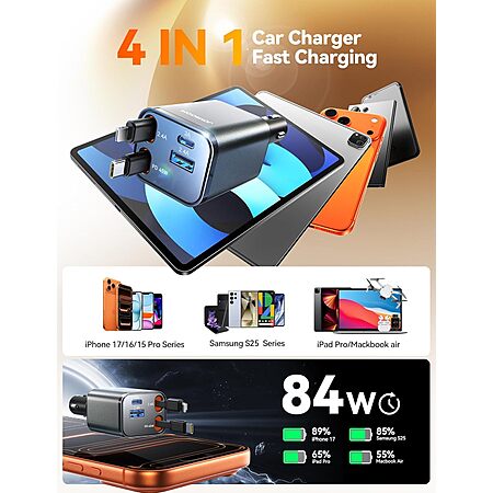 Prime Members: Joyroom 4-in-1 up to 84W Retractable USB-C + Lightning Car Charger (Gray or Black) $11.04 + Free Shipping Prime Members: Joyroom 4-in-1 up to 84W Retractable USB-C + Lightning Car Charger (Gray or Black) $11.04 + Free Shipping Amazon January 24th, 2026 7:41pm Joyroom 4-in-1 Retractable Car ChargerAvailable Colors: Gray Black $24.00 $11 Buy from Amazon
