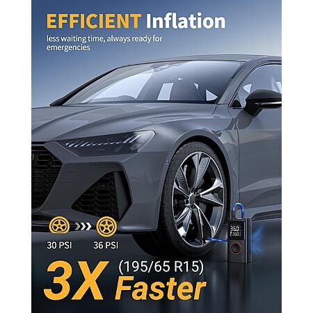 • 3X Faster Inflation: Say goodbye to waiting! Inflate a standard car tire from 30 to 36PSI in under a minute.