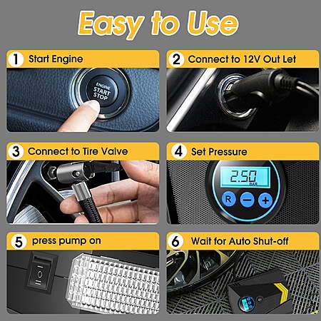 - 12V Portable Air Compressor: Plugs directly into your car’s power outlet.