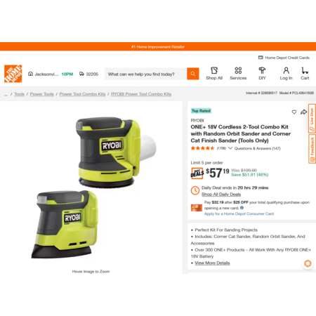 RYOBI ONE+ 18V Cordless 2-Tool Combo Kit with Random Orbit Sander and Corner Cat Finish Sander (Tools Only) $57.19 RYOBI ONE+ 18V Cordless 2-Tool Combo Kit with Random Orbit Sander and Corner Cat Finish Sander (Tools Only) $57.19 Home Depot March 6th, 2026 2:51am Nothing to extract. $109.00 $57 Buy from Home Depot