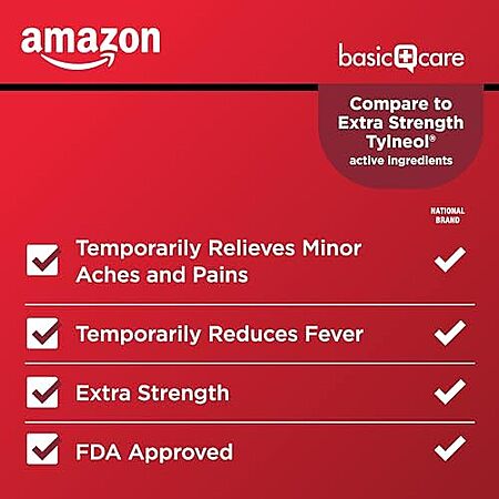 Maximum Strength Pain ReliefExperience powerful relief with Amazon Basic Care Extra Strength Acetaminophen Caplets. Each caplet contains 500 mg of acetaminophen to help reduce fever and provide relief from minor aches and pains due to: