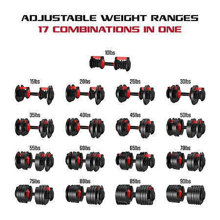 - Seventeen weight settings: from 10 to 90lbs in 5lb increments
