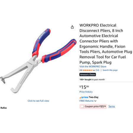 WORKPRO Electrical Disconnect Pliers, 8 Inch Automotive Electrical Connector Pliers w/Ergonomic Handle. YMMV – Coupon Price $11.19