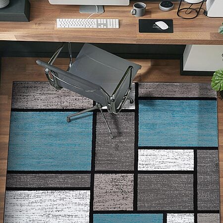 - Modern Geometric Design: Inspired by Mondrian-style box patterns, featuring intersecting rectangles in layered tones of blue, ivory, and gray. This rug adds structure and visual balance to any contemporary interior.