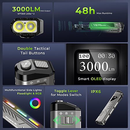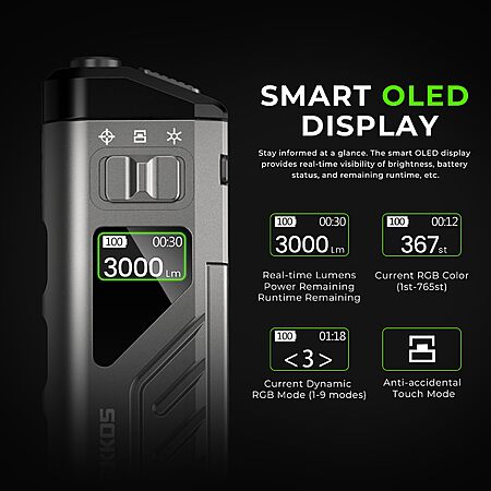 - Smart Display: OLED screen shows lumens, battery level, remaining time, and mode.