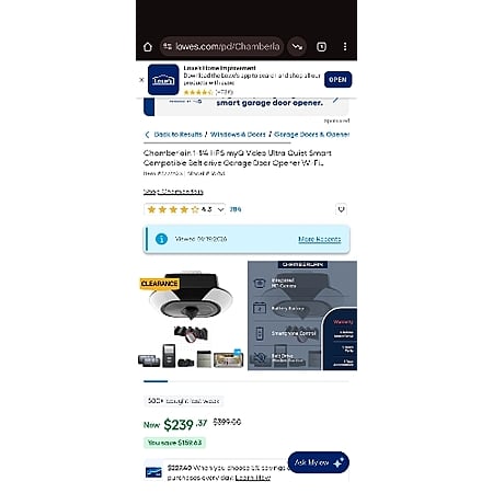 YMMV -$239 Chamberlain 1-1/4 HPS myQ Video Ultra Quiet Smart Compatible Belt drive Garage Door Opener YMMV -$239 Chamberlain 1-1/4 HPS myQ Video Ultra Quiet Smart Compatible Belt drive Garage Door Opener Lowe's January 22nd, 2026 5:01am $399.00 $239 Buy from Lowe's