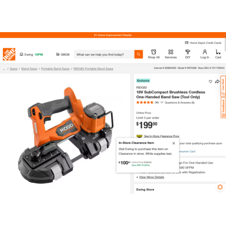 YMMV – Select Home Depot Stores: RIDGID 18V SubCompact Brushless Cordless One-Handed Band Saw (Tool Only) $100.02 YMMV - Select Home Depot Stores: RIDGID 18V SubCompact Brushless Cordless One-Handed Band Saw (Tool Only) $100.02 Home Depot February 26th, 2026 12:29am $199.00 $100 Buy from Home Depot